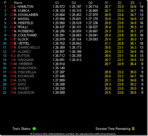 Hamiltom, Kubica, Kovalainen. A Ferrarinak nem ment jól, Raikkonen büntiből 15. helyen. Jó volt, látványos, bár a közvetítők nem mindig voltak a helyzet magaslatán.